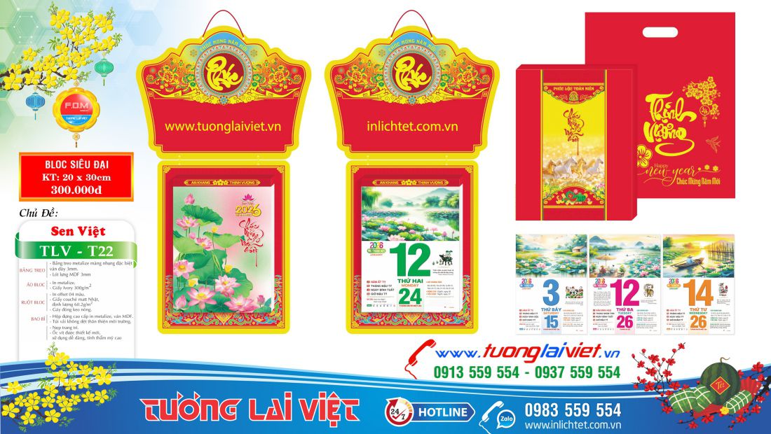 Lịch bloc Sen việt là món quà ý nghĩa mà người Việt ai cũng cần có để trang trí trong ngôi nhà vào những ngày đầu năm mới. Mẫu lịch bloc được thiết kế theo các kích thước bloc như: Lịch bloc siêu cực đại (30×40), Lịch bloc khổ cực đại (25×35), Lịch bloc siêu đại (20×30), Lịch bloc Khổ đại (17×24) và Lịch bloc khổ lớn nhất hiện nay kích thước (38×54). Bên cạnh đó, Bìa lịch bloc còn được làm bằng gỗ Laminate tráng gương bóng kính.