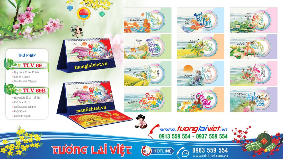 Ngoài Lịch để bàn Chữ thư pháp, In TLV còn sản xuất và phân phối những Mẫu Lịch Tết Treo Tường gắn với các Mẫu Lịch Bloc Khổ Đại như: Lịch Bloc Siêu Cực Đại (30×40) khổ A3, Lịch Bloc khổ Cực Đại (25×35), Lịch Bloc Siêu Đại (20×30) Khổ A4, Lịch Bloc Khổ Đại (17×24), Lịch Bloc Đại (15×20) khổ A5 gắn với Bìa Lịch và Lịch Bloc khổ lớn nhất hiện nay kích thước (38×54). Bên cạnh đó, còn có Mẫu Lịch Bloc Bìa Laminate, Lịch Gỗ Laminate và Lịch Gỗ Phù Điêu Cao Cấp.