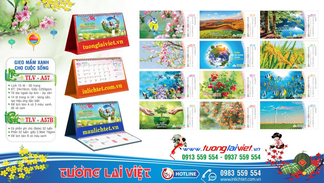 Mẫu Lịch để bàn Môi trường và cuộc sống là món quà mà hầu như công ty nào cũng chọn In lịch để bàn đẹp để làm quà tặng cho khách hàng, bạn bè, đối tác và người thân nhân dịp năm mới. Mẫu Lịch Để Bàn năm nay được in trên Giấy Couche định lượng 230gsm và 250gsm. Mẫu Lịch Để Bàn được In TLV sản xuất theo các kích thước 16×23, 19×22, 24×16, 24×18 gồm có: Lịch Để Bàn chữ A và Lịch Để Bàn chữ M có thêm phần Note Ghi Chú.