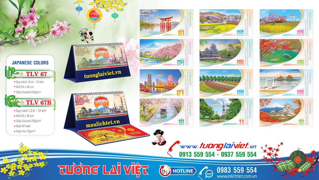 Mẫu Lịch để bàn Sắc màu nhật bản là món quà mà hầu như công ty nào cũng chọn In lịch để bàn đẹp để làm quà tặng cho khách hàng, bạn bè, đối tác và người thân nhân dịp năm mới. Mẫu Lịch Để Bàn năm nay được in trên Giấy Couche định lượng 230gsm và 250gsm. Mẫu Lịch Để Bàn được In TLV sản xuất theo các kích thước 16×23, 19×22, 24×16, 24×18 gồm có: Lịch Để Bàn chữ A và Lịch Để Bàn chữ M có thêm phần Note Ghi Chú.