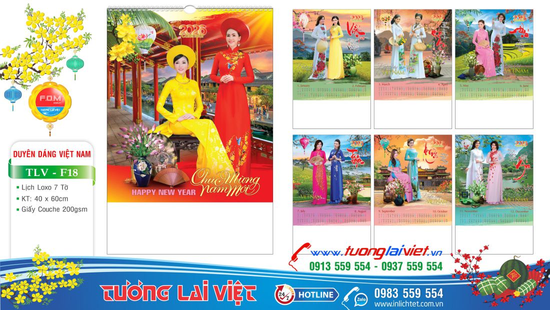 Lịch treo tường 7 tờ Áo dài Việt Nam là mẫu lịch lò xo 7 tờ giá rẻ phù hợp với các đơn vị, cơ sở nhỏ lẻ như: Tiệm tạp hoá, Cửa hàng gas, Cửa hàng gạo, Cửa hàng bánh kẹo, Cửa hàng xăng dầu, Cửa hàng vật liệu xây dựng. Mẫu lịch treo tường 7 tờ được nhiều đơn vị chọn In Lịch Tết để làm quà tặng cho khách hàng nhân dịp cuối năm.
