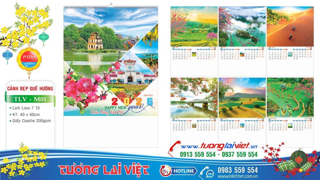 Lịch treo tường 7 tờ Cảnh đẹp Việt Nam là mẫu lịch lò xo 7 tờ giá rẻ phù hợp với các đơn vị, cơ sở nhỏ lẻ như: Tiệm tạp hoá, Cửa hàng gas, Cửa hàng gạo, Cửa hàng bánh kẹo, Cửa hàng xăng dầu, Cửa hàng vật liệu xây dựng. Mẫu lịch treo tường 7 tờ được nhiều đơn vị chọn In Lịch Tết để làm quà tặng cho khách hàng nhân dịp cuối năm.