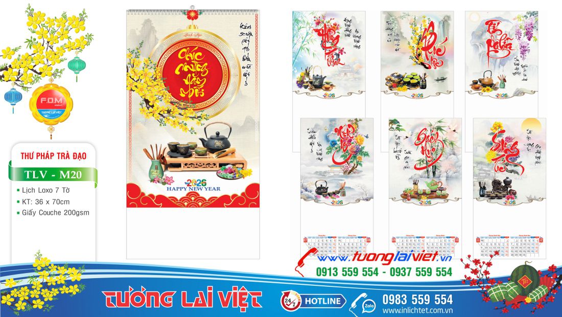 Ngoài Mẫu Lịch treo tường 7 tờ Chữ thư pháp, In TLV còn sản xuất và phân phối những mẫu lịch tết treo tường gắn với các Mẫu Lịch Bloc như: Lịch bloc Siêu cực đại (30×40) khổ A3, Lịch bloc khổ Cực đại (25×35), Lịch bloc Siêu đại (20×30) khổ A4, Lịch bloc đại (15×20), (17×24), khổ A5 gắn với Bìa lịch và Lịch Bloc khổ lớn nhất hiện nay kích thước (38×54). Bên cạnh đó, còn có Lịch Bloc Laminate, Lịch gỗ Laminate và Lịch gỗ Phù Điêu cao cấp.