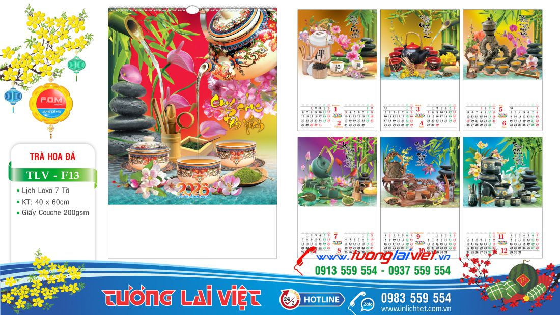 Lịch treo tường 7 tờ Trà đạo là mẫu lịch lò xo 7 tờ giá rẻ phù hợp với các đơn vị, cơ sở nhỏ lẻ như: Tiệm tạp hoá, Cửa hàng gas, Cửa hàng gạo, Cửa hàng bánh kẹo, Cửa hàng xăng dầu, Cửa hàng vật liệu xây dựng. Mẫu lịch treo tường 7 tờ được nhiều đơn vị chọn In Lịch Tết để làm quà tặng cho khách hàng nhân dịp cuối năm.