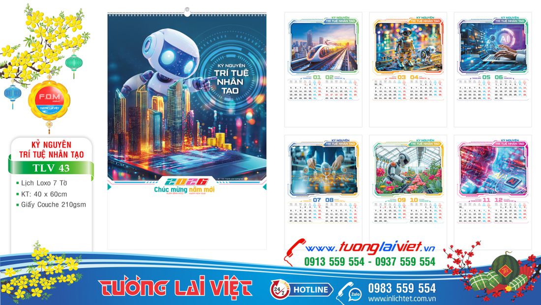 Lịch treo tường 7 tờ Trí tuệ nhân tạo là mẫu lịch lò xo 7 tờ giá rẻ phù hợp với các đơn vị, cơ sở nhỏ lẻ như: Tiệm tạp hoá, Cửa hàng gas, Cửa hàng gạo, Cửa hàng bánh kẹo, Cửa hàng xăng dầu, Cửa hàng vật liệu xây dựng. Mẫu lịch treo tường 7 tờ được nhiều đơn vị chọn In Lịch Tết để làm quà tặng cho khách hàng nhân dịp cuối năm.